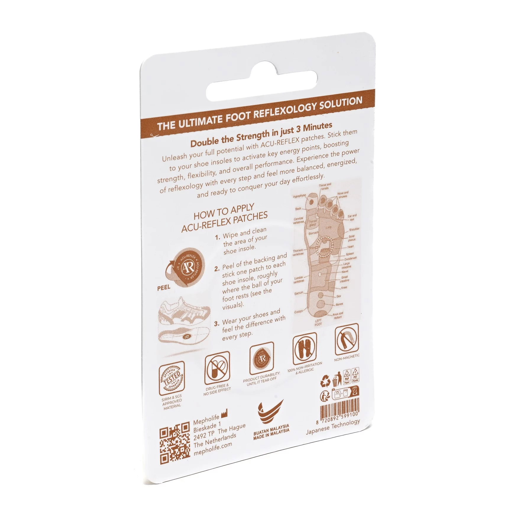 Acu-Reflex is based on the Acu-Resonance Method™, working with the body’s natural warmth. It is placed inside the shoe, aligned with a specific area of the foot commonly used in reflexology to support balance and comfort in the legs. The approach is non-invasive, free from additives or active ingredients, and designed for consistent wear.