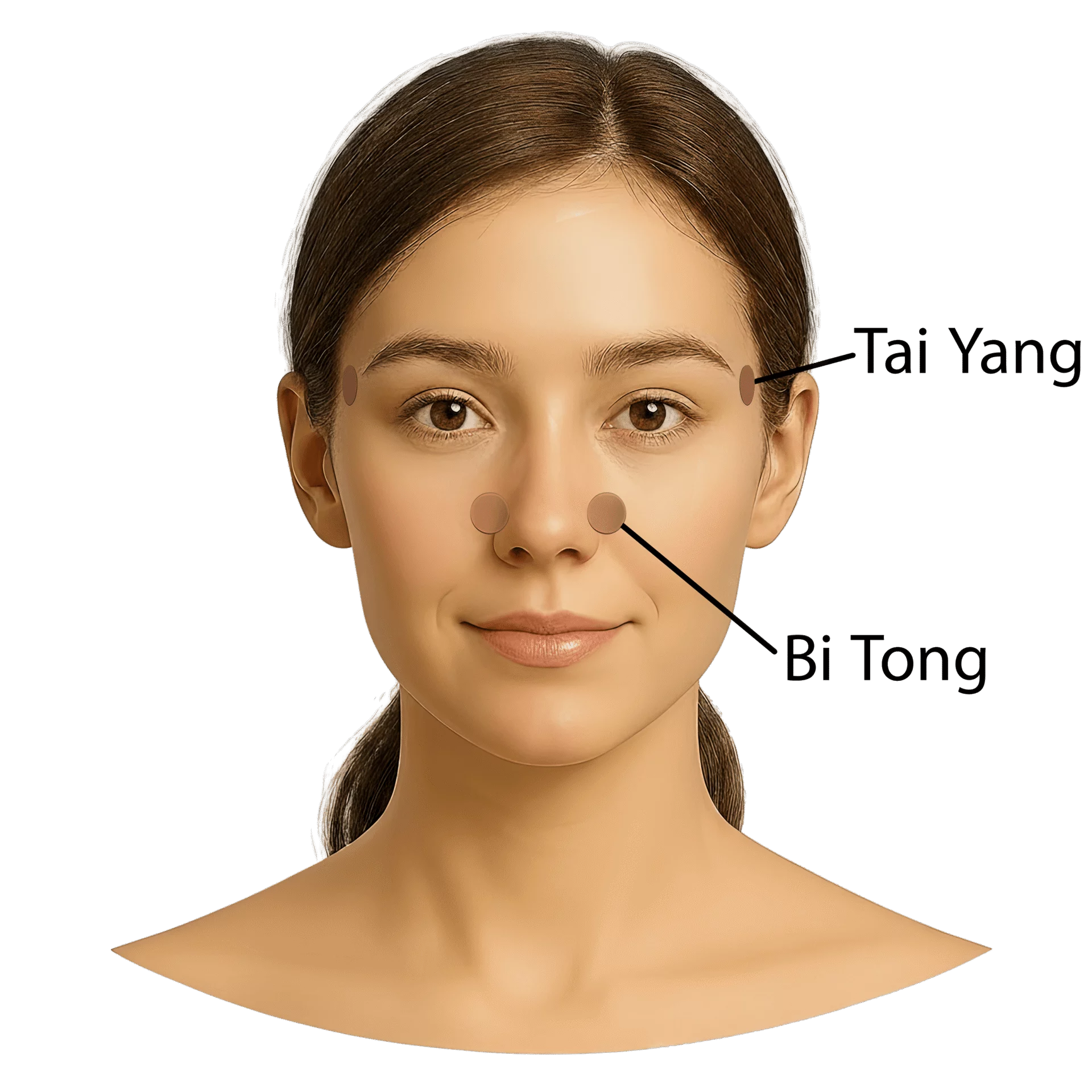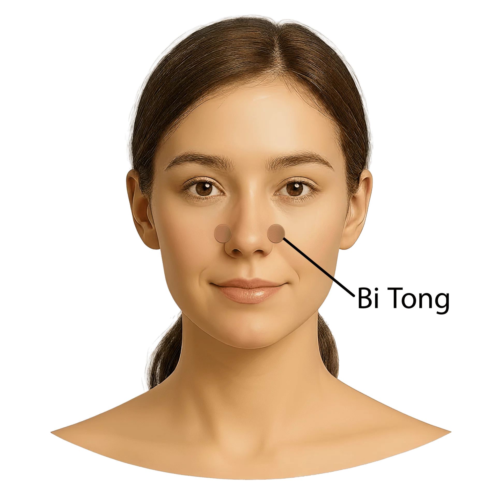 - Bi Tong (beside the nose) Located beside the nostrils, this point is traditionally associated with nasal comfort and easier breathing.