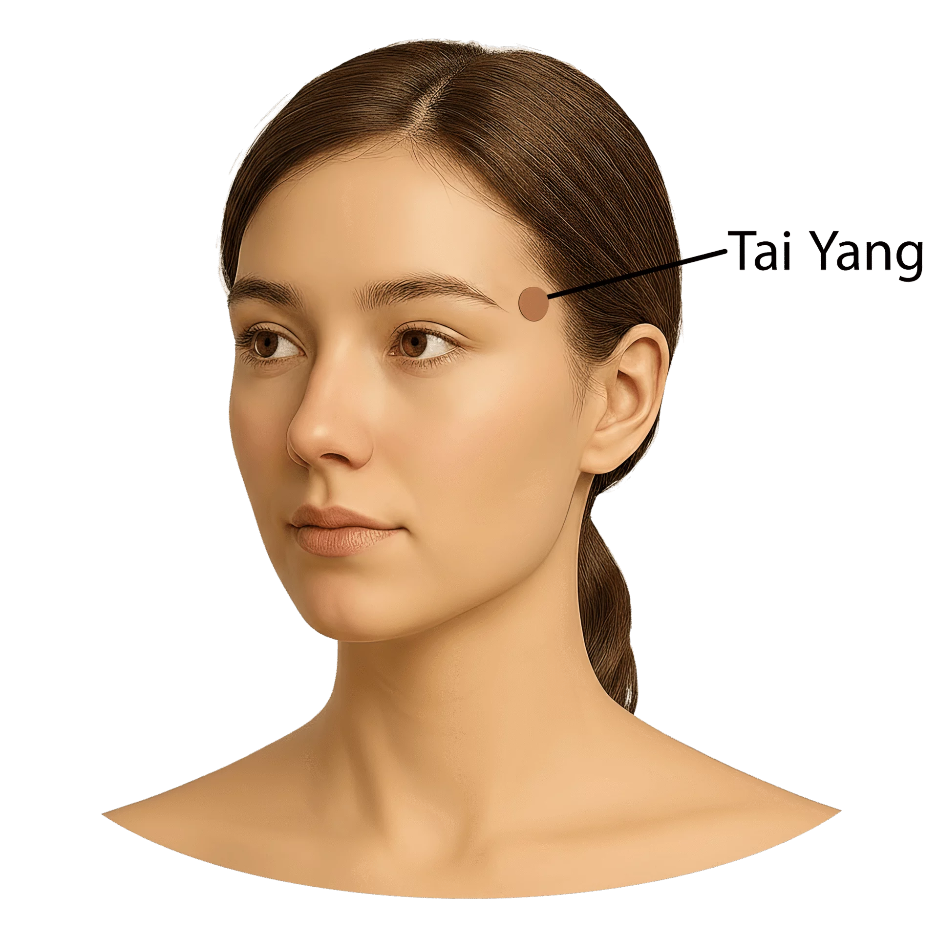 - Tai Yang (temples) Located at the temples, this point is traditionally associated with relieving head tension and pressure around the head.