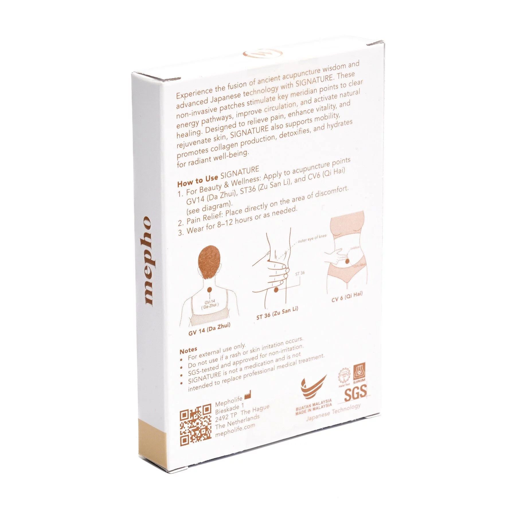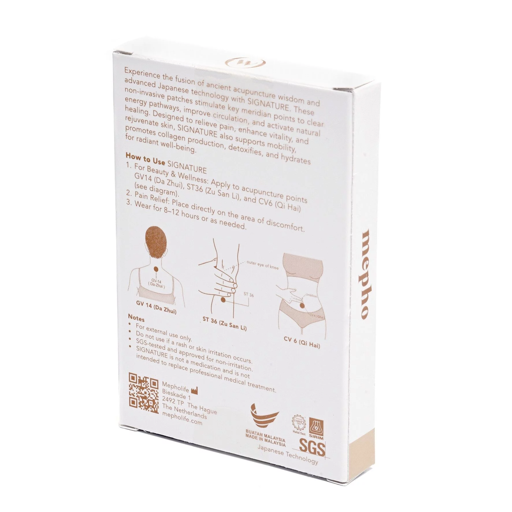 Signature uses the Acu-Resonance Method™, Mepho’s approach to wearable support. Each patch contains a specially developed layer that is activated by the body’s natural warmth. When placed on specific acupoint-inspired locations, it provides subtle, non-invasive support.